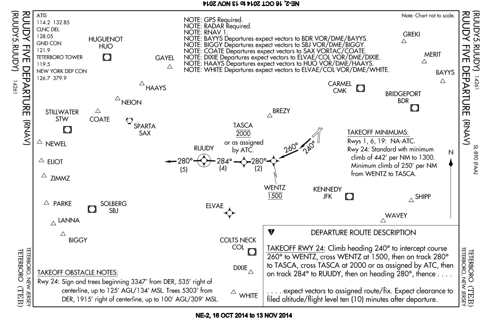 If you stated your aircraft is equipped with acceptable RNAV equipment when you filed your IFR flight plan, ATC might assign you an RNAV departure procedure. From the pilot’s perspective, an RNAV departure is just like any other. You are simply flying by reference to waypoints instead of traditional navaids and fixes. Out of Teterboro, a properly equipped airplane may be assigned the Ruudy Five Departure. Notice that the Ruudy Five is basically the same thing as the Teterboro Nine off runway 24. The RNAV version is quite a bit simpler to remember and comply with, from the pilot’s perspective, however.