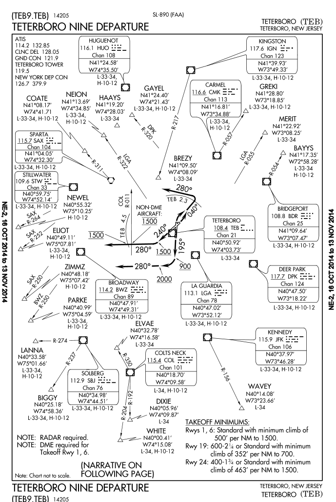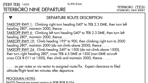 Many departure procedures, such as the Teterboro Nine Departure will state initial headings to be flown. Let’s say you were cleared via the Teterboro Nine, Broadway, then as filed, and told to expect runway 24 for departure. You would look at the route description for takeoff from runway 24. It instructs you to climb on a 240 heading after takeoff until you reach 1,500 feet. Then, you should level off at 1500 and turn right to a 280 heading. Stay at that heading and altitude until you cross either the TEB 4.5 DME or the COL 11 degree radial, then climb and maintain 2000 feet. From there you will receive instructions to join your route.