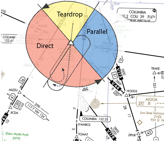 If we were approaching Columbia from the northwest, a teardrop entry would be more appropriate. For a teardrop entry, we would fly cross the VORTAC and then turn to a heading 30 degrees off of the holding radial. In this case, we would take a 180 heading for one minute. After the minute is up, turn right to intercept the 210 radial inbound.
