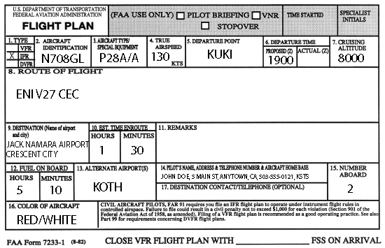 It is now time to perform the rest of the calculations, such as computation of times, fuel burn, takeoff and landing distances, cruise power setting, true airspeed, and weight and balance. Fuel required for IFR flights is the amount of fuel it takes to get to the destination airport, from there to the alternate airport, and then fly for 45 minutes at cruise power. After these computations are finished, the completed flight log might look something like this: