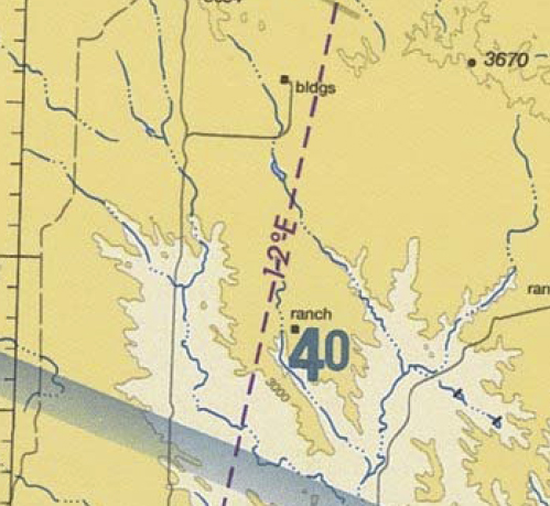 Lines of magnetic variation are shown on navigation charts as dashed magenta lines. These lines are used in navigation planning to correct true course to magnetic course by adding west variation or subtracting east variation. A magnetic variation of 12 degrees east in indicated in this example. This means there is a 12 degree east variation between true north and magnetic north in this area.
