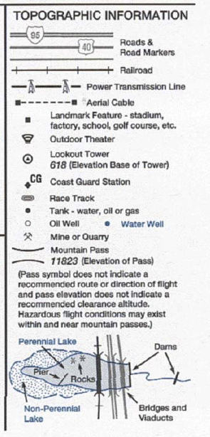 Features such as roads, railroads, power lines, bridges, and cultural boundaries are shown on navigation charts. Additionally, visible landmarks such as stadiums, factories, large tanks, quarries, etc., are shown.