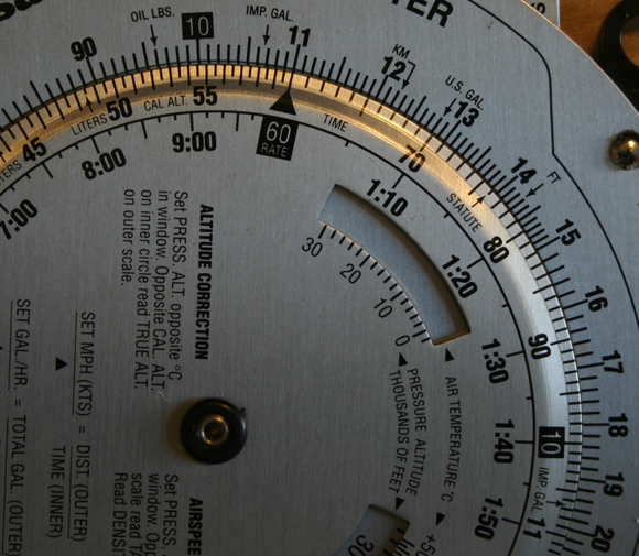 Place the rate pointer at the rate of fuel burn. Find the number of gallons remaining on the outer scale and time remaining on the inner scale.