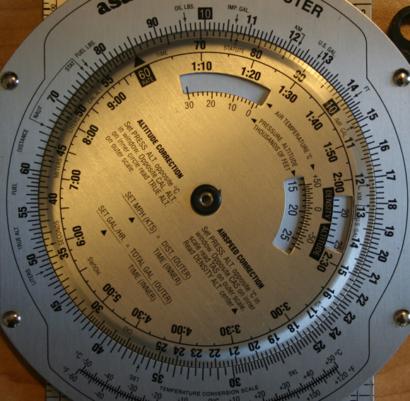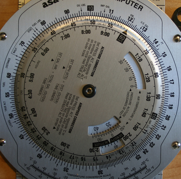 Place the rate pointer on the rate of fuel burn. Read time on the inner scale and fuel burned on the outer scale.